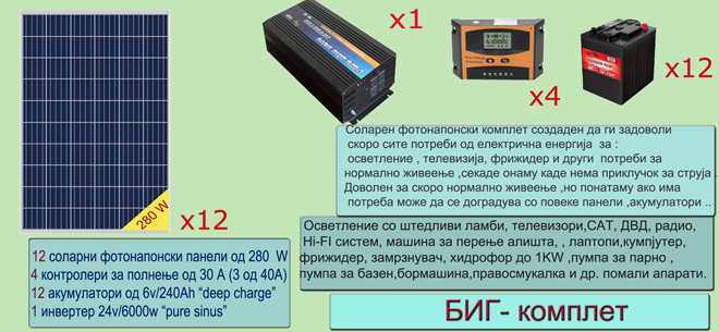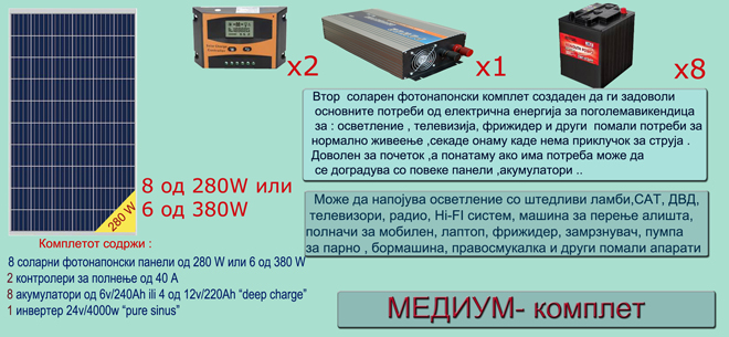 Најмалиот комплет од поголемите ..Произведува ел.струја за напојување на осветление со штедливи ламби од 5-10W навечер, радио, телевизор , фрижидер,замрзнувач лаптоп, сателитски и ДВД уред.Повремено прилучување на бормашина или помала правосмукалка .Секаде каде нема приклучок од ЕВН овој комплет ке Ви озможи нормално живеење со електрични уреди.Може ,со додавање на уште панели , акумулатори и контролери да се надоградува до исполнување на Вашите потреби.