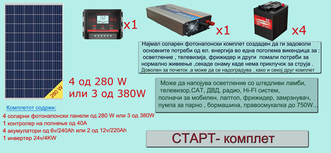 Малку појак комплет за куќа..Произведува ел.струја за напојување на осветление со штедливи ламби од 5-10W навечер, радио, телевизор , фрижидер,замрзнувач ,лаптоп,машина за перење алишта , пумпа за парно или за соларен систем за топла вода, сателитски и ДВД уред..Повремено прилучување на бормашина или помала правосмукалка .Секаде каде нема приклучок од ЕВН овој комплет ке Ви озможи нормално живеење со електрични уреди. Може ,со додавање на уште панели , акумулатори и контролери да се надоградува до целосно исполнување на Вашите потреби.